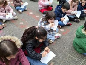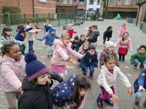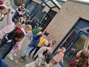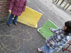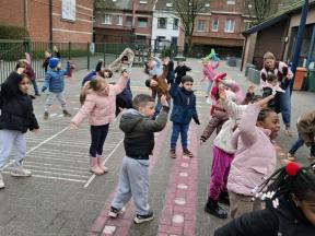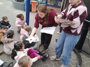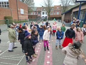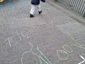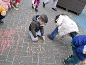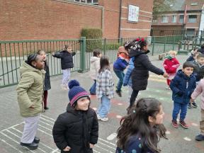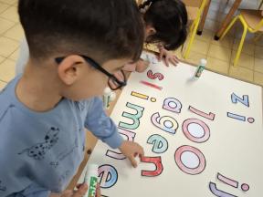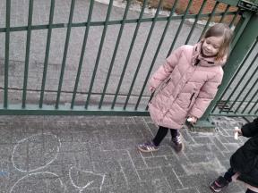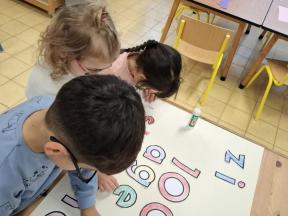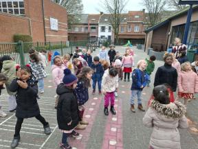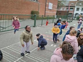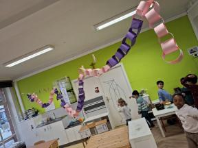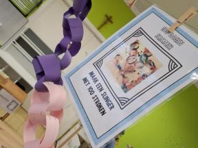 Samen met de kleuters maakten we een 100 slinger, steeds 10 groepjes van 10 rondjes.