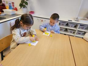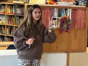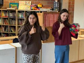 Samen met Bollie leerden we het cijfer 2. Wij hebben allemaal 2 armen, 2 benen, 2 oren, 2 ogen, .... De kleuters genoten weer van het poppenspel.