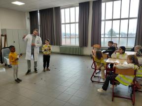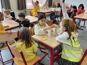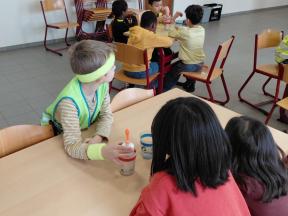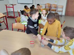 We leerden dat warmte beweging is, stijgt en uitzet. Dit mochten we met enkele proefjes zelf ondervinden.