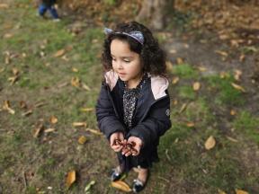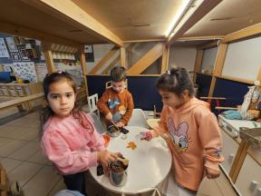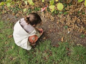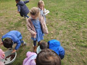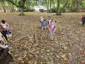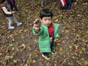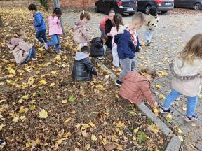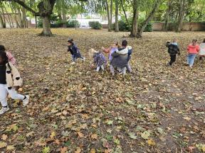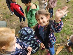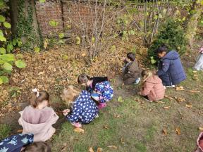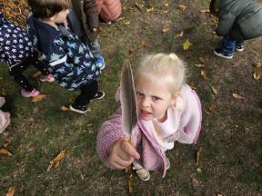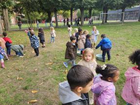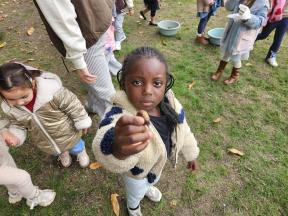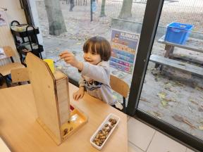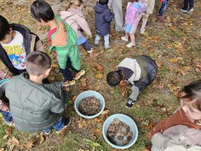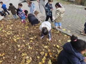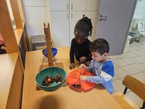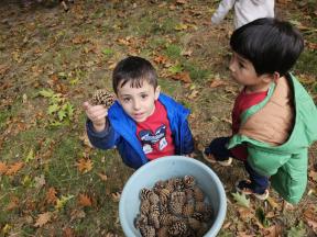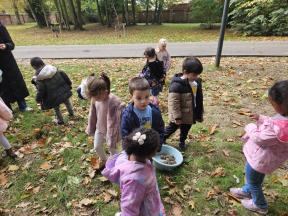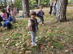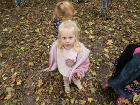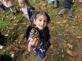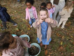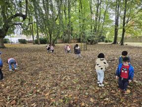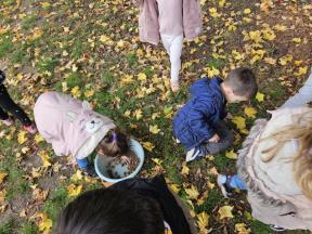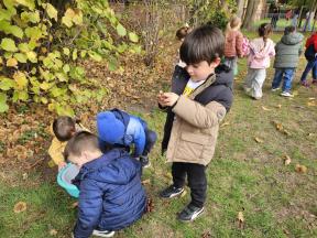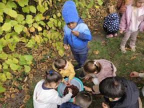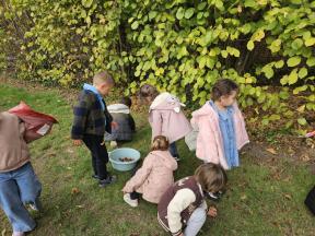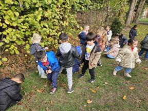 Samen met de flamingo's gingen we op zoek naar herfstvruchten. We verzamelden heel wat kastanjes, eikels en dennenappels!